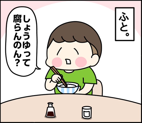 このブログは、私くま子・旦那(タカシ)娘(マルコ/中学生)長男(イチオ/小学生)次男(ミツオ/3歳半)の日常漫画です?要冷蔵ー!!醤油差しの醤油はすぐ···